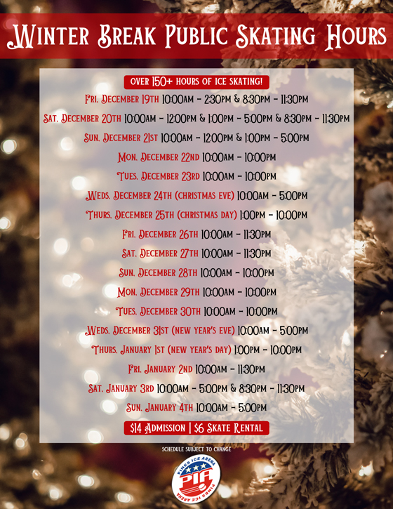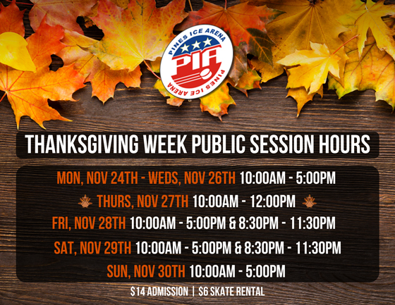 New prices effective 8/15/22. Pricing is for admission only | All public session times are subject to 10 minute interruption for resurfacing | Admission is required for entrance during evening sessions, even if you are not skating | Schedule excludes holidays & special events | Schedule is subject to change without notice | Pines Ice Arena is not responsible for lost or stolen items